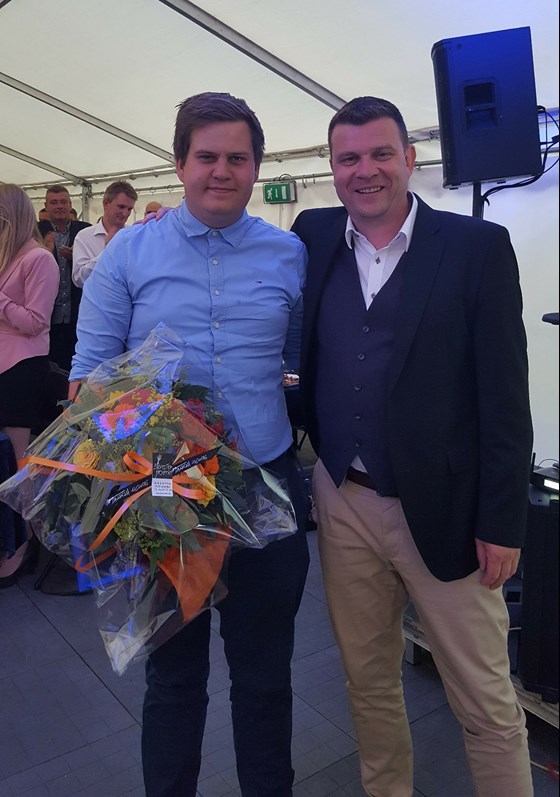 En stolt Nicolai Hermansen flankeret af formand Søren Burchall Foto: John Bødker