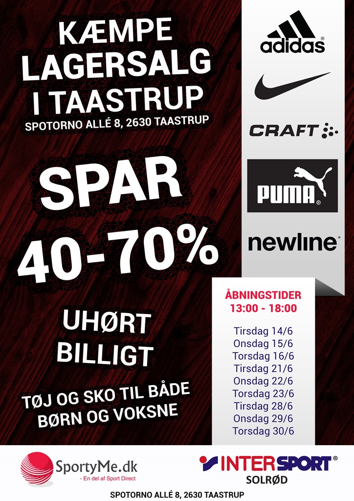 HIC's gode sponsor Sports Direct i Tåstrup inviterer til lagersalg i juni måned, hvor du kan score fine besparelser på lækkert sportstøj og sko