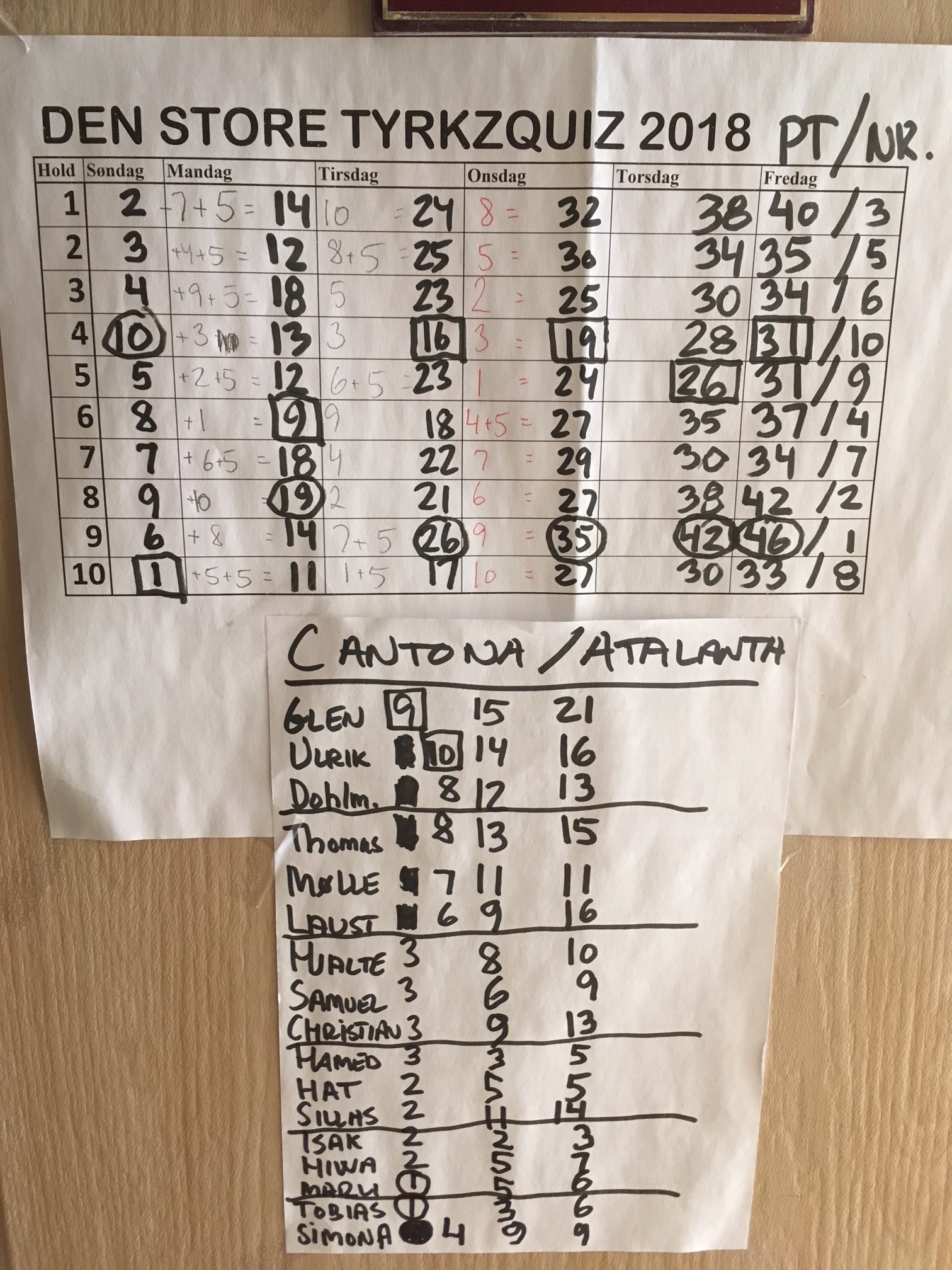 Efter udflugten til Belek var det ’hjem’ til mere hatteleg. Den Store Tyrkquiz fandt sin afgørelse med sejr til Hold 9 og efter et sindsoprivende finale fik Hold 4 fornøjelsen af at rejse hjem med de dinglende narrehatte, men inden fik den samlede trup lov til at give den en på hatten i hotellets bar og diskotek med det logiske resultat, at flere havde gevaldigt ondt i hatten, da turen gik hjemad mod det noget køligere nord.