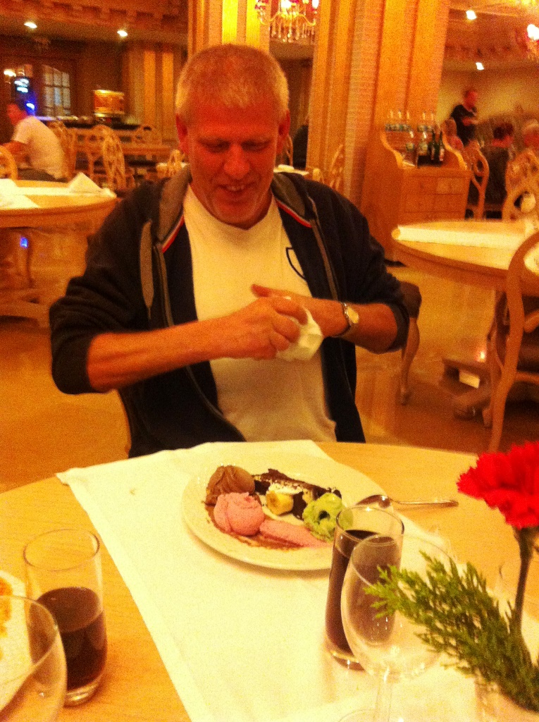 Her ses en mand. Han er glad. Men kagen og isen på hans tallerken overlevede ikke.