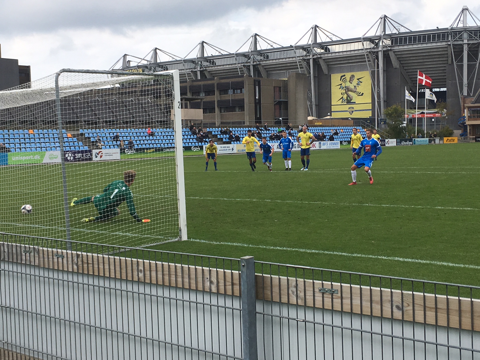 Med Brøndby Stadion i baggrunden reducerer Nicolai Beck med sit syvende mål i denne sæson på et straffespark begået mod ham selv. Foto: Allan Nielsen