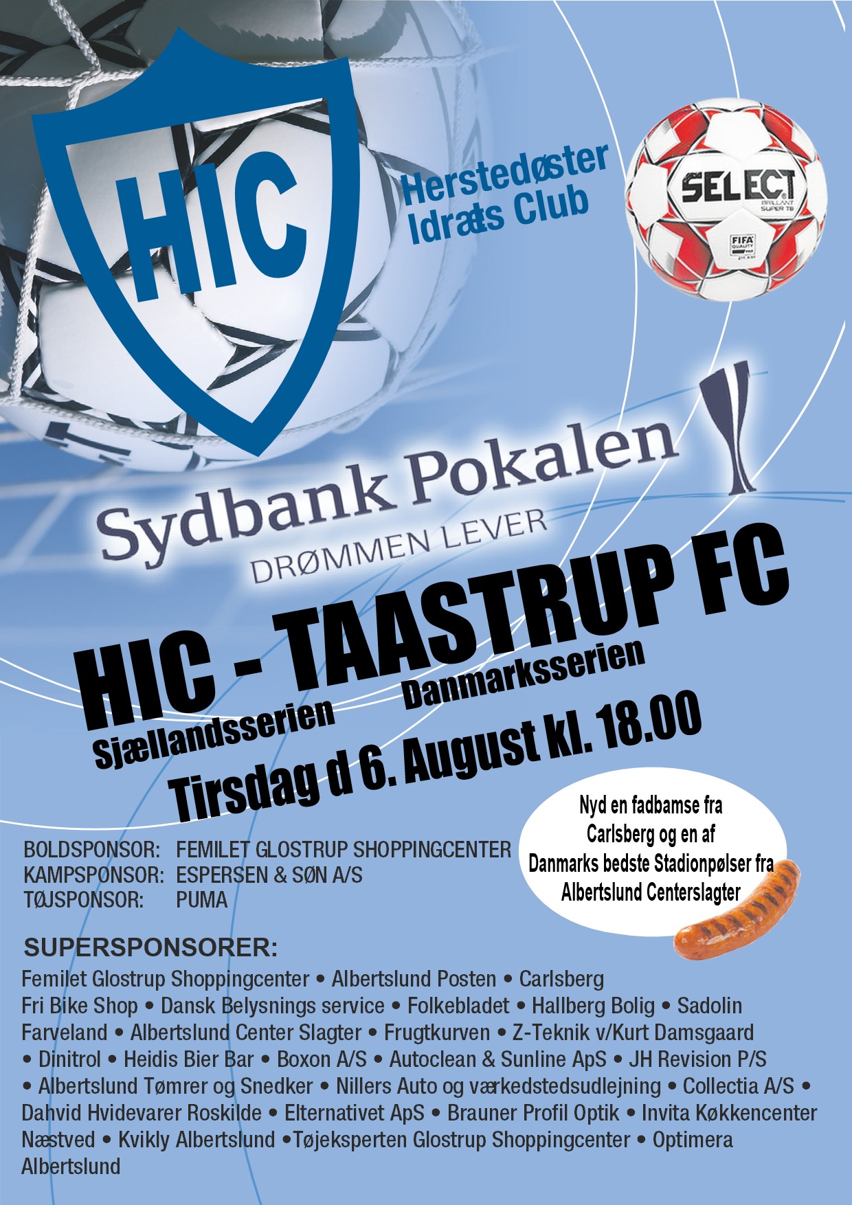 Vi tyvstarter sæsonen på hjemmebane tirsdag den 6 august kl 18.00 med en første rundekamp i DBU's Sydbank Pokal mod vores naboer fra Danmarksserien Taastrup FC - Holdene ligger godt til hinanden, så vi forventer en tæt og lige kamp.....og hvis held og dygtighed rammer vores drenge og spiller sig videre til næste runde, kan de skrive et nyt kapitel i HIC's historie. HIC har aldrig været i 2 runde før.....hvis vi lige ser bort fra vores kvindesenior.