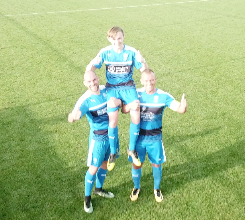 Efter med et fremragende hovedstød at have scoret sit første mål som seniorspiller fik 17-årige Sillas Gyldelsøe en fortjent hyldest. Glen Vielsted og Ulrik Nielsen var af ukendte årsager ikke i stand til at give Frederic Vibe, kampens anden målscorer, samme tur. Foto: David Clements drone