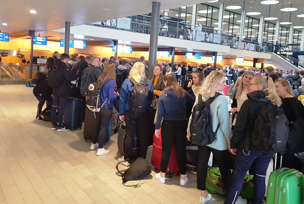 Det store HIC-selskab gav naturligt en lang kø ved indcheckningen i København Lufthavn