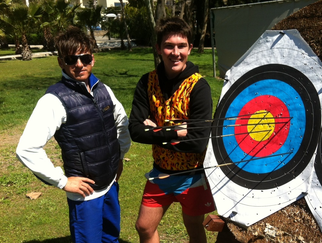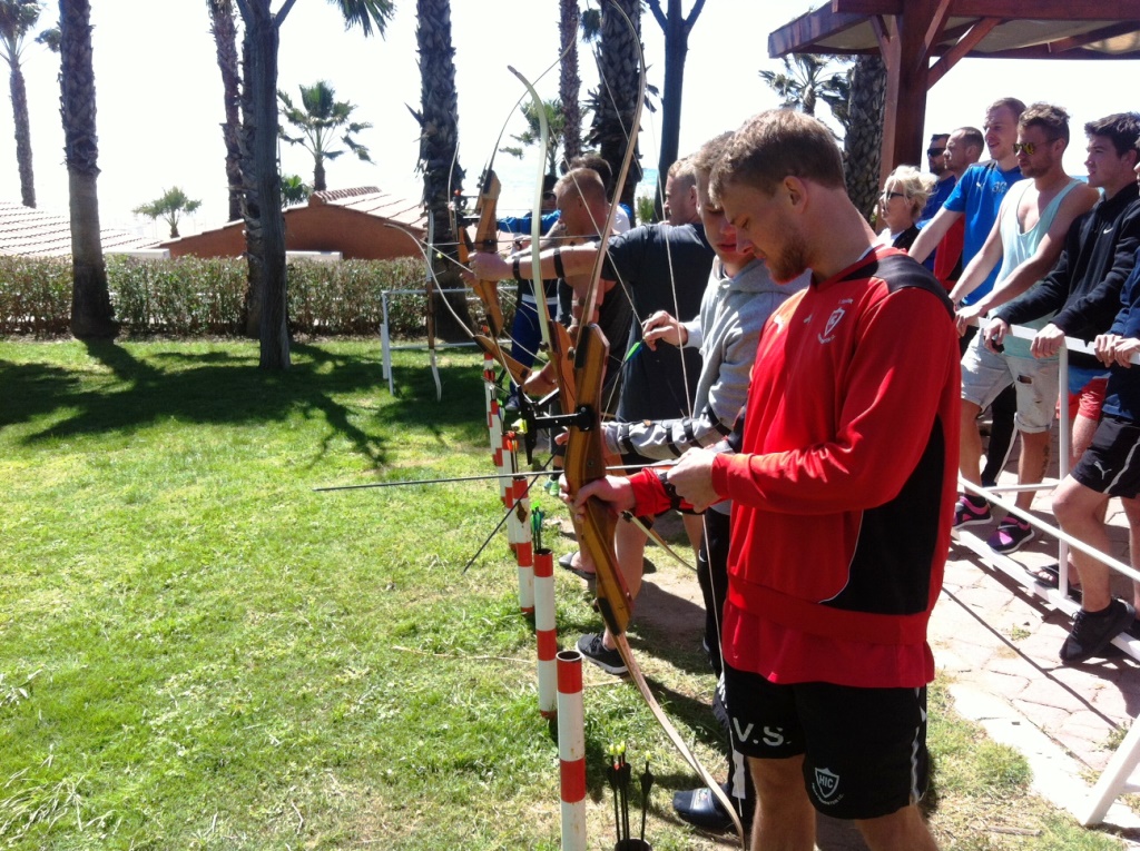 Vinden stod med voldsom kraft ind fra Middelhavet, da spillere, trænere, ledere og medfølgende fruer for alvor spændte buen og skød til måls efter de forræderisk små skive 12-14 meter væk, men der var rigeligt fart på pilene til, at vinden faktisk slet ikke havde den store indflydelse på retningen.