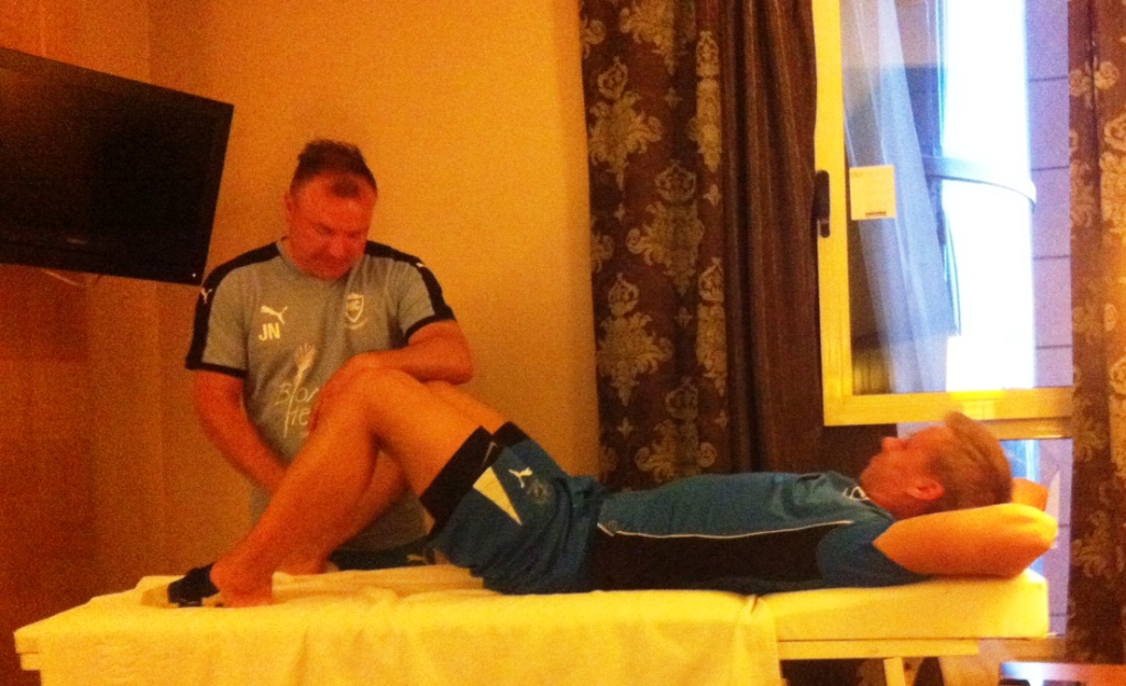 Som trænerteam har vi også lært af de foregående års ture, hvor det især sidste år blev til en bekymrende stribe skader. Doseringen med træning af en times varighed og uden den store fysiske belastning var medvirkende til, at skaderne begrænsede sig til en slagskade til Anton Hartmann, en belastningsskade, der givet Tobias en betændt akillessene samt lidt ømhed hist og her hos de øvrige - og så tog John resten i opløbet i det velbesøgte massørrum.